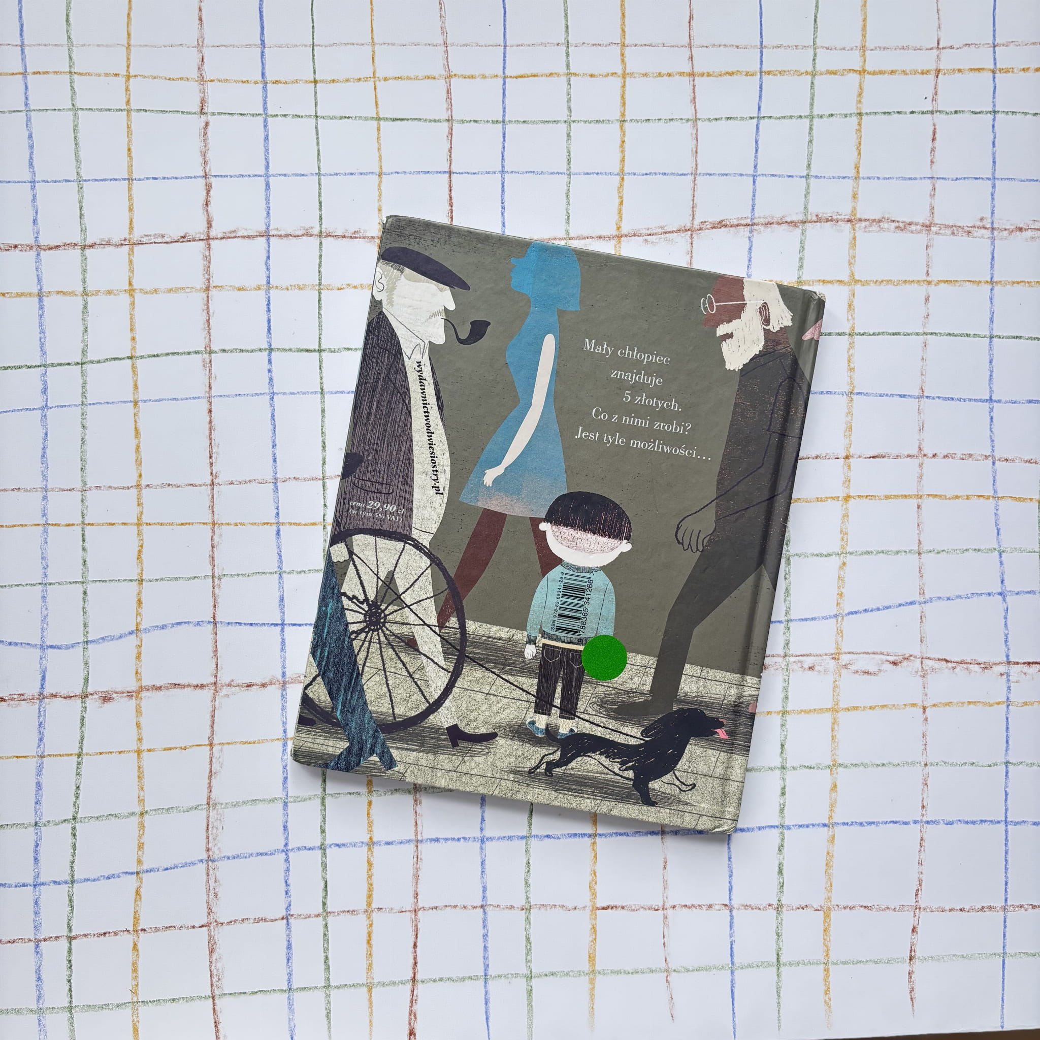 Bohater znajduje pięć złotych i zastanawia się, na co je przeznaczyć. Prosta, przemyślana historia opowiedziana w formie pięknych ilustracji pokazuje, jak działają wybory i jaka jest wartość pieniądza, zachęcając do rozmowy o potrzebach, pragnieniach i odpowiedzialności.