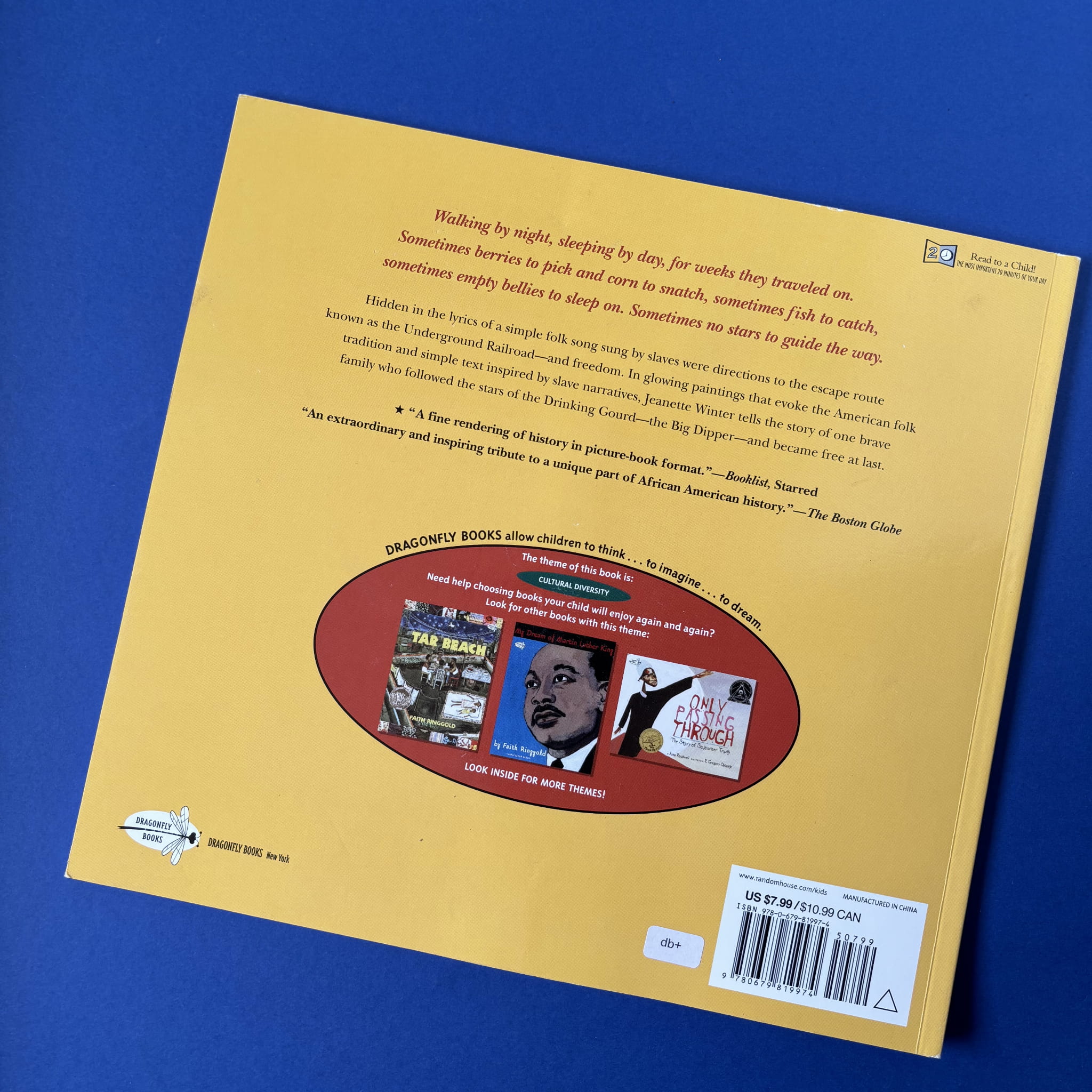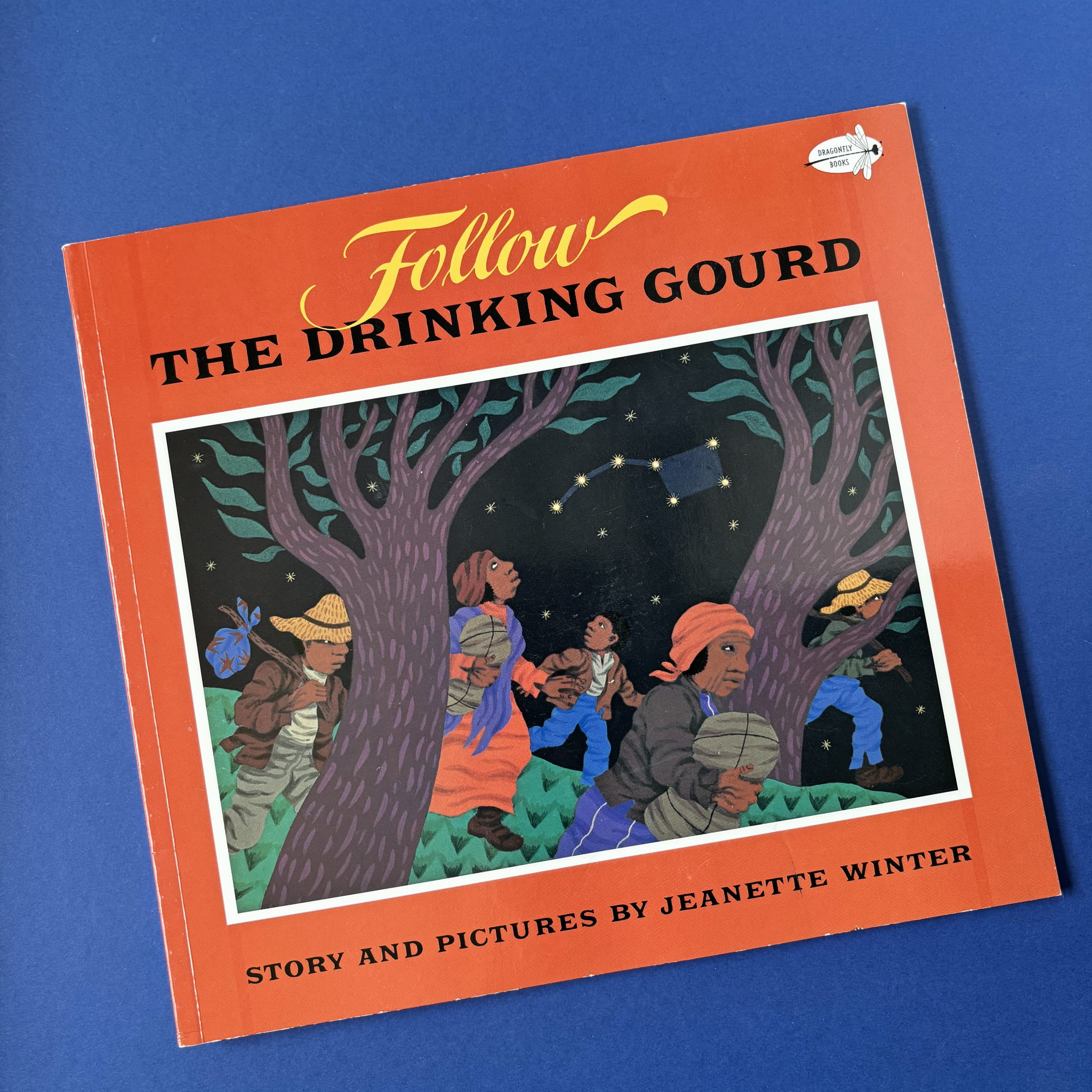 Książka w języku angielskim przenosi czytelników w czas niewolnictwa w USA, do epoki przed Wojną Secesyjną. Mityczny żeglarz na drewnianej nodze – Peg Leg Joe – uczy uciekinierów piosenki „Follow the Drinking Gourd”, której tekst („Drinking Gourd” oznacza Wielką Niedźwiedzicę) zawiera wskazówki: podążać za gwiazdami, brzegiem rzeki, przez wzgórza aż do rzeki Ohio, gdzie czeka pomoc Underground Railroad .