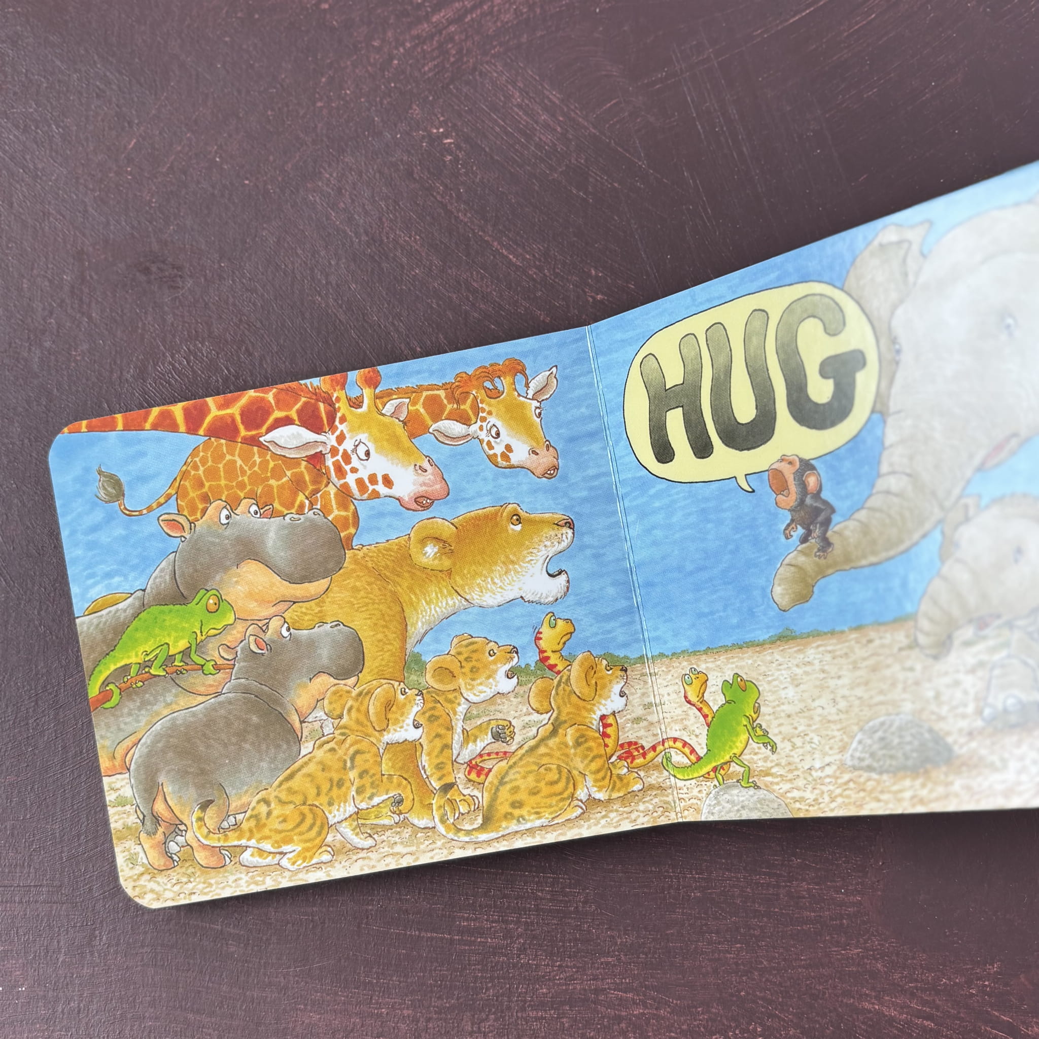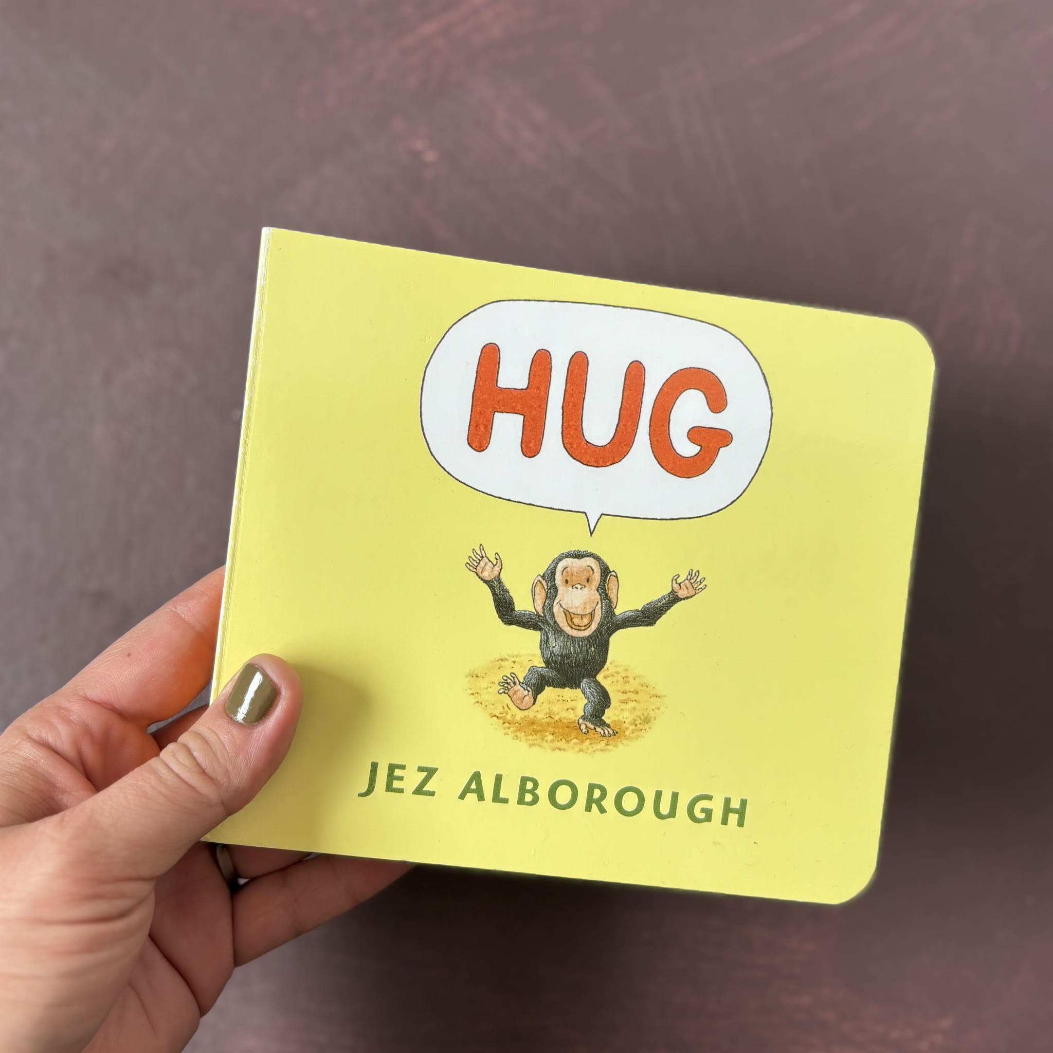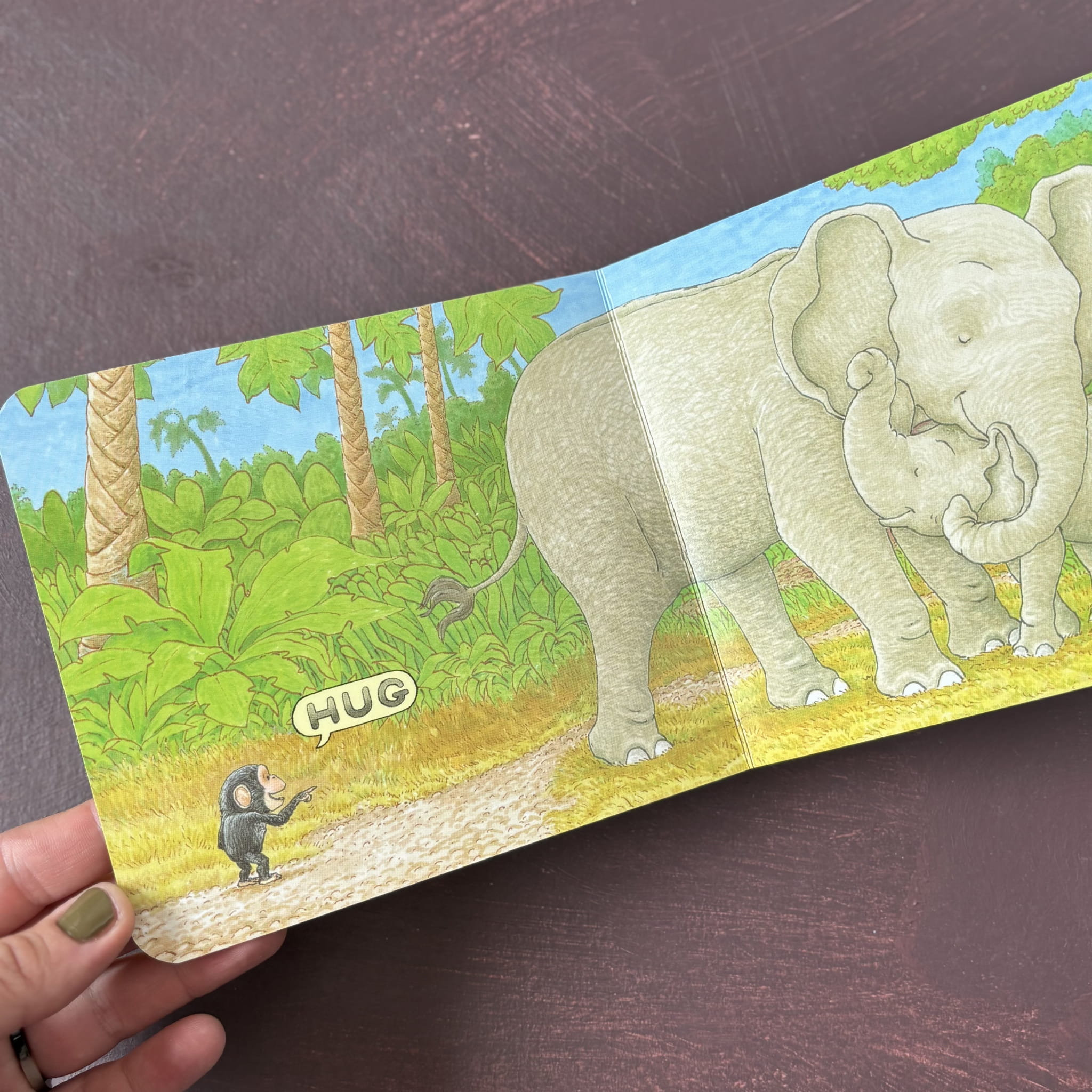 To książka w języku angielskim, opowiadająca historię małej goryliczki Bobo, który poszukuje przytulenia („hug!”) – jego jedyne słowo. Wędruje przez dżunglę, widząc innych przytulających się, ale żadne interakcje nie są dla niego wystarczające. Dopiero słonie prowadzą go do ukojenia, pokazując moc bliskości. W książce użyte są tylko trzy słowa, za to ilustracje są pełne emocji i subtelnej ekspresji – dynamiczne, pełne ciepłych barw i zwracające uwagę na uczucia bohatera.