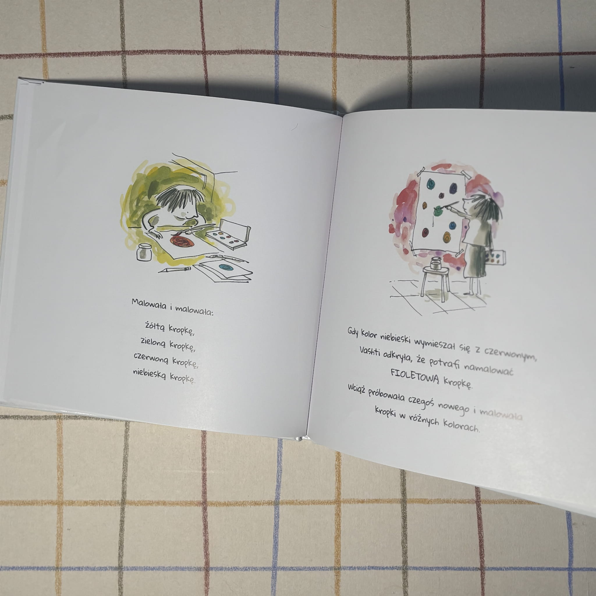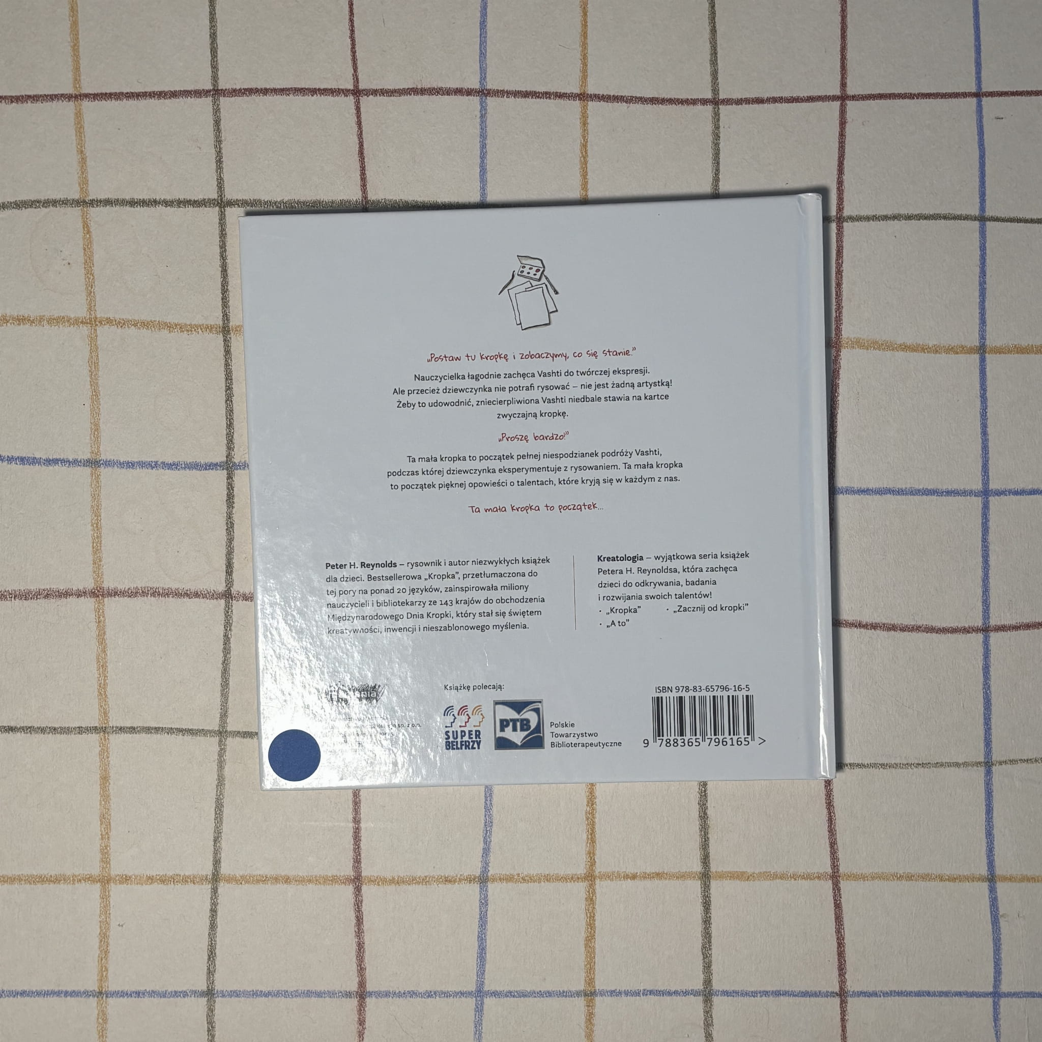 Vashti uważa, że nie potrafi rysować, dopóki nauczycielka nie zachęca jej, by zaczęła od postawienia zwykłej kropki. Ta prosta sytuacja staje się początkiem opowieści o wierze w siebie, odwadze w próbowaniu i radości tworzenia. Minimalistyczne ilustracje i oszczędny tekst sprawiają, że książka często staje się inspiracją do działań plastycznych i rozmów o kreatywności.