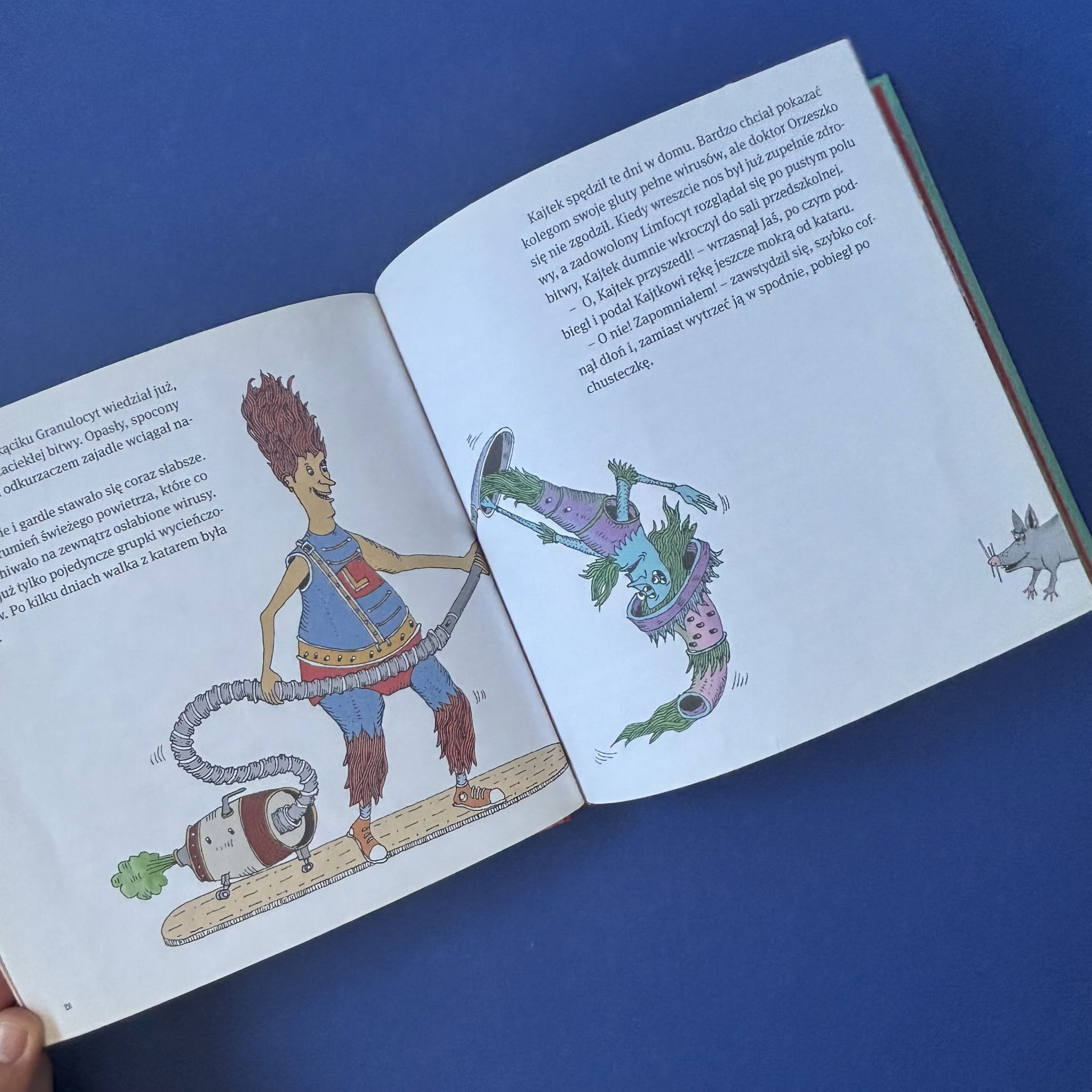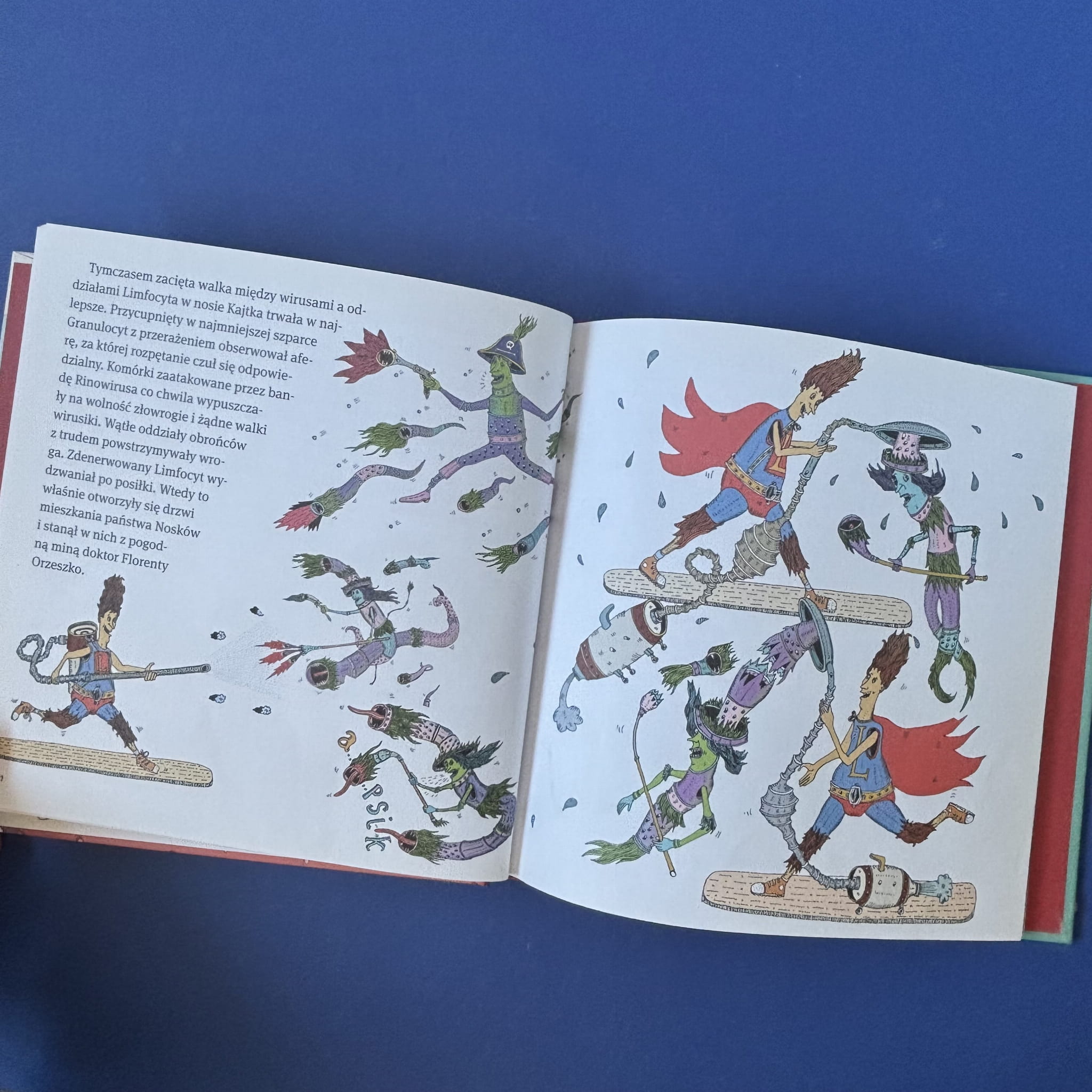 Książka opowiada o przygodach doktora Florentego Orzeszki, który w humorystyczny sposób tłumaczy dzieciom, czym jest przeziębienie. Przedstawia inwazję rinowirusów na organizm oraz reakcję układu odpornościowego, ukazując limfocyty i inne komórki jako bohaterów walczących z infekcją. Ilustracje Ignacego Czwartosa dodają opowieści dynamiki i pomagają dzieciom zrozumieć procesy zachodzące w ich ciałach podczas choroby. Książka łączy elementy edukacyjne z zabawną narracją, czyniąc temat zdrowia przystępnym i interesującym dla najmłodszych czytelników.