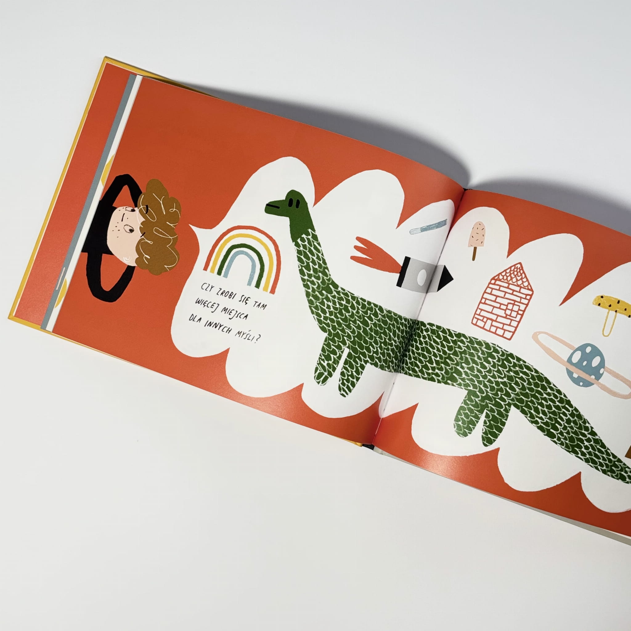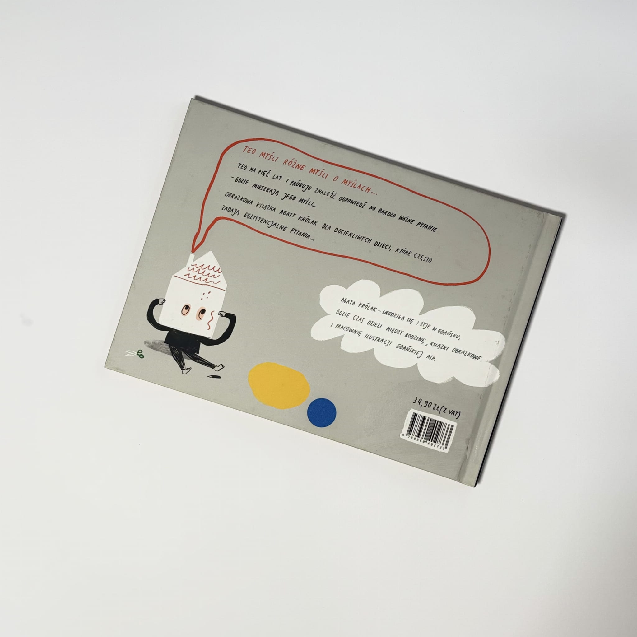 Teo odkrywa, że myśli potrafią być różne – wesołe, smutne, spokojne albo niespokojne – i że przychodzą i odchodzą jak chmury. Prosty tekst i oszczędne, charakterystyczne ilustracje pomagają dzieciom zauważać własne emocje i stany, zachęcając do rozmowy o uważności, przeżyciach i sposobach radzenia sobie z tym, co dzieje się w głowie.