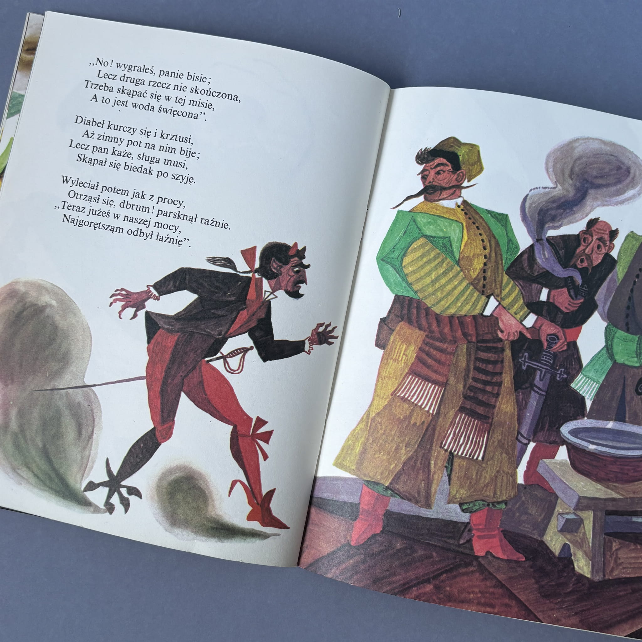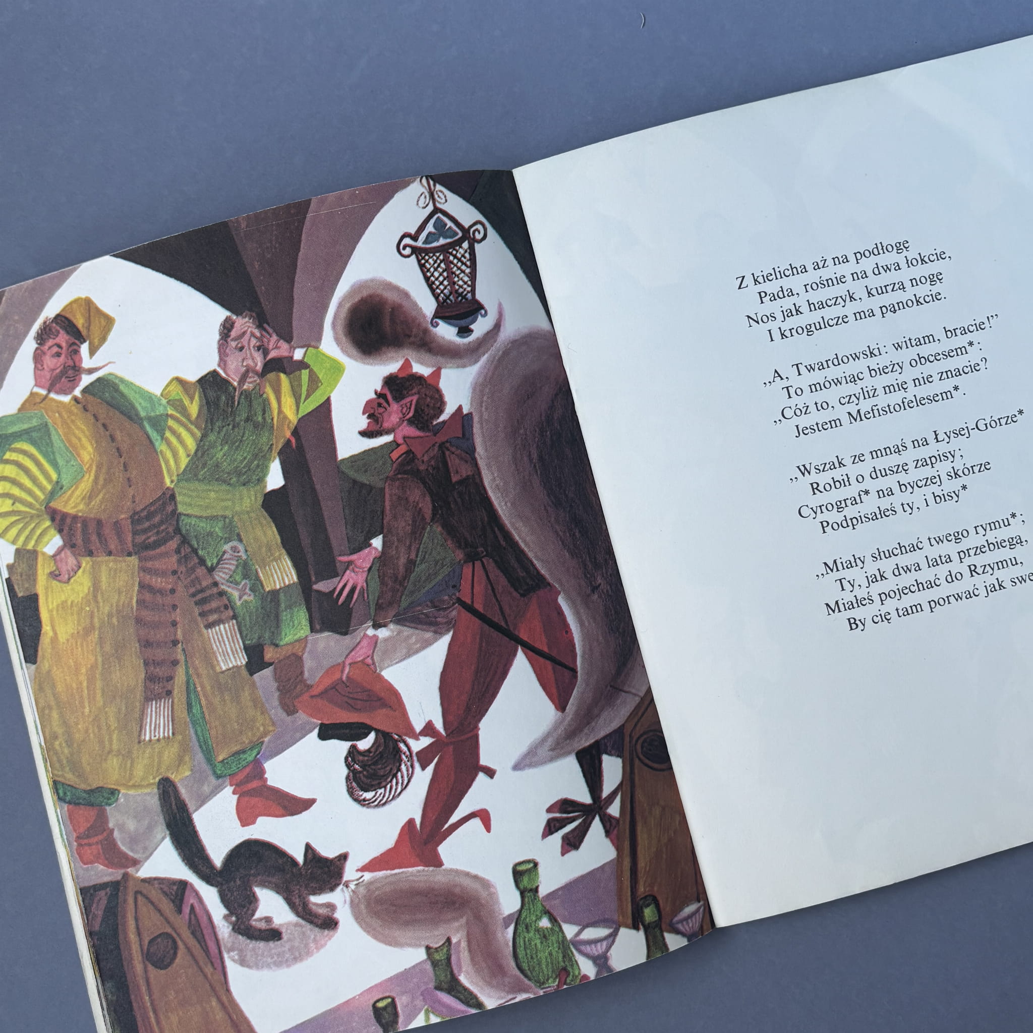 Ballada opowiada historię Twardowskiego, który zawarł pakt z diabłem, ale sprytnie próbuje wykręcić się od zapłaty – posyłając czarta po swoją żonę, znaną z trudnego charakteru. Utwór, napisany przez Mickiewicza z literackim wdziękiem i humorem, łączy elementy ludowej opowieści z błyskotliwą puentą. Ilustracje Zbigniewa Rychlickiego, mistrza książki dziecięcej, wprowadzają dynamiczne, wyraziste postacie i nutę teatralnego napięcia, znakomicie podkreślając komiczno-dramatyczny charakter tej literackiej perełki.
