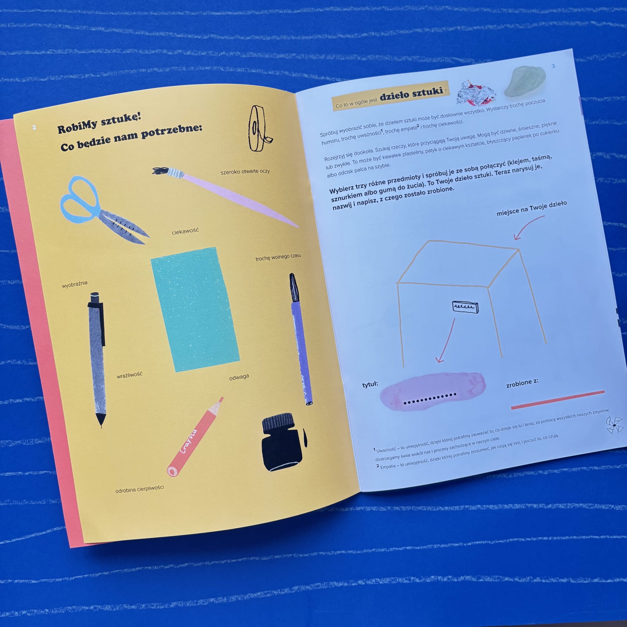 „RobiMy Sztukę" to pięknie wydany materiał do kreatywnych działań, który wprowadza dzieci w świat sztuki, poprzez zadania oparte na eksperymencie, obserwacji i samodzielnym myśleniu. Nie narzuca jednego poprawnego rozwiązania, a zachęca do poszukiwań, zadawania pytań i budowania własnych interpretacji.