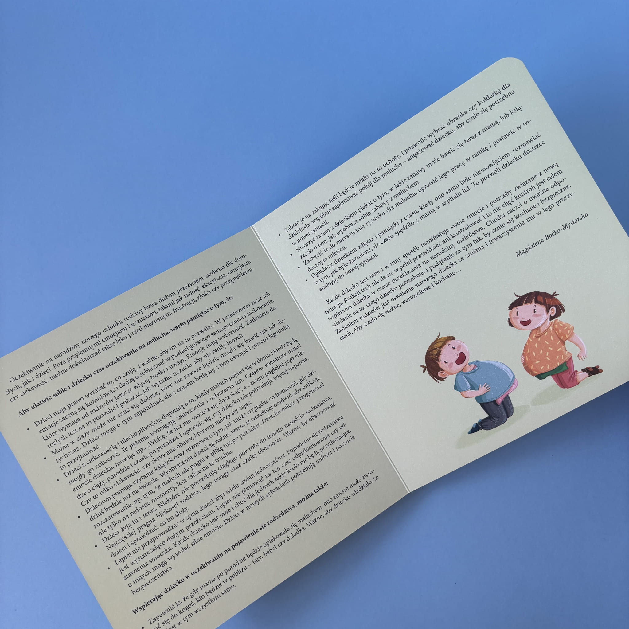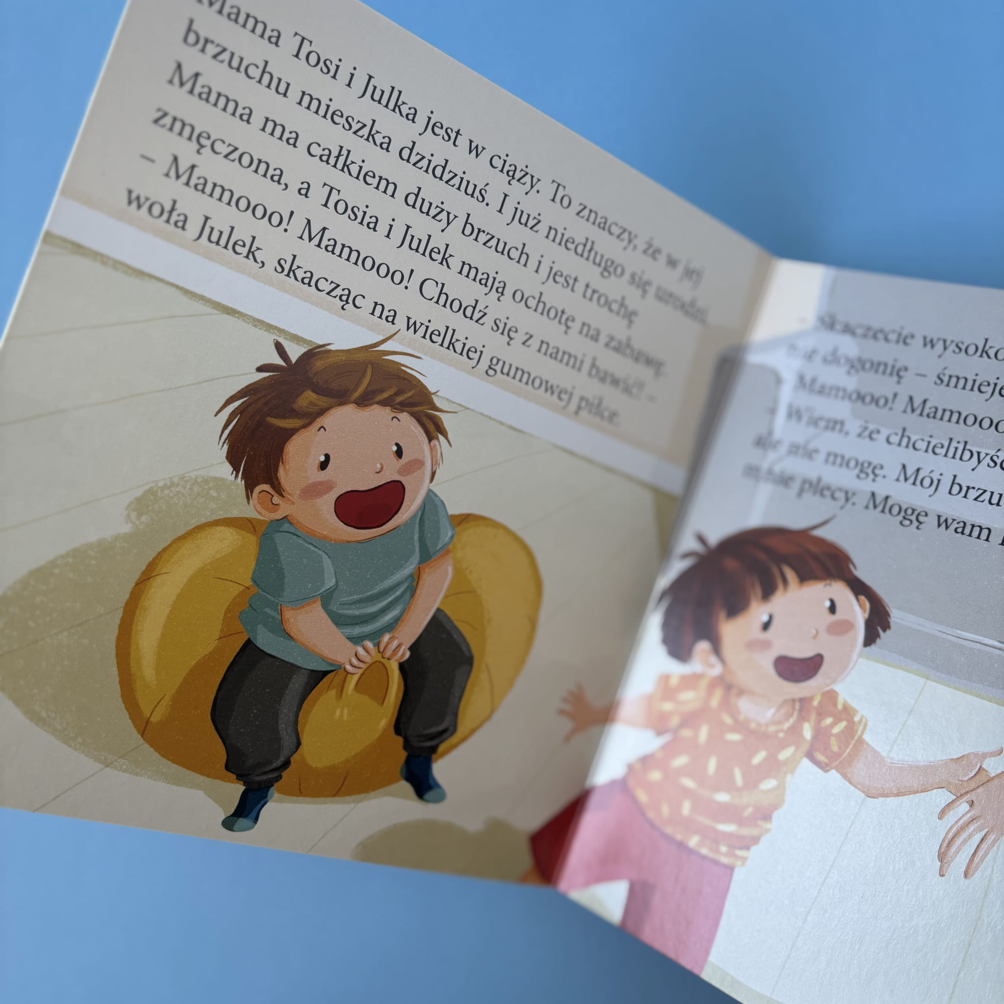 Mama Tosi i Julka spodziewa się dziecka, co staje się dla rodzeństwa nowym doświadczeniem pełnym emocji. Tosia z radością oczekuje na braciszka, natomiast Julek odczuwa frustrację i niezrozumienie, zwłaszcza gdy mama nie może już bawić się z nimi jak wcześniej. Książka w delikatny sposób ukazuje różnorodność reakcji dzieci na zmiany w rodzinie, podkreślając znaczenie rozmowy, empatii i wsparcia ze strony dorosłych. To wartościowa lektura dla rodzin przygotowujących się na powiększenie rodziny, pomagająca dzieciom zrozumieć i zaakceptować nadchodzące zmiany.